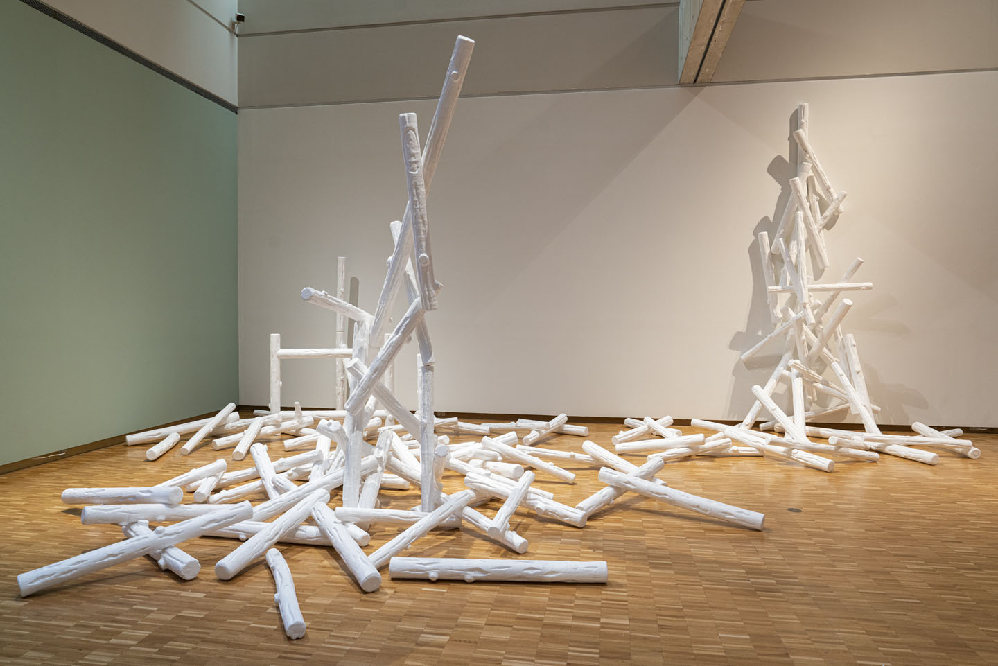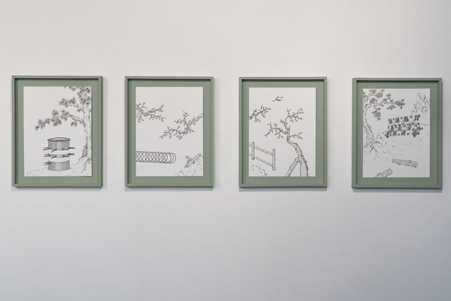 My ongoing series "Fallout" and "Fortified...Super Drawing" engage with situations that are often hidden, contested, and fraught with tension. These works explore the consequences of rigid and precarious territorial demarcations. In "Fallout", fragile faux log sculptures, held together only by magnets, symbolize the instability of such boundaries. The work references the 2008 fatal shooting of a South Korean tourist who unknowingly crossed into an unmarked restricted area near North Korea’s Diamond Mountains, exposing the tragic effects of invisible and unyielding borders. In the "Fortified...Super" Drawing series, I draw on traditional Asian landscape painting tropes to depict scenes along the Korean Demilitarized Zone (DMZ). These drawings highlight the psychological tension and propaganda embedded in this militarized space, while also underscoring the irony that this contested zone has evolved into an ecological refuge—an unintended sanctuary born from ongoing conflict.